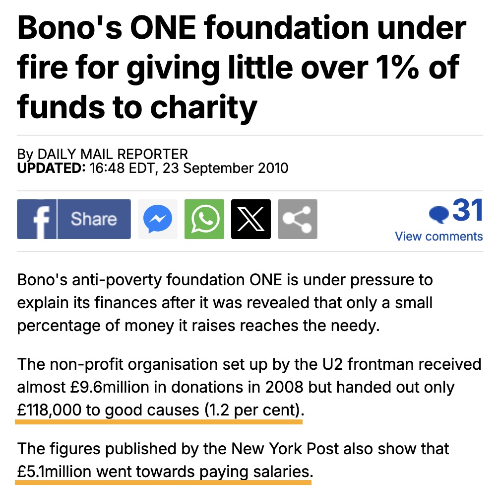 We read that Bono and his employees initially took 99.5% of the ONE Foundation donations, but lowered it to 98.5% when he was previously investigated and called out on their hypocrisy. Bono must know who to suck or pay off.