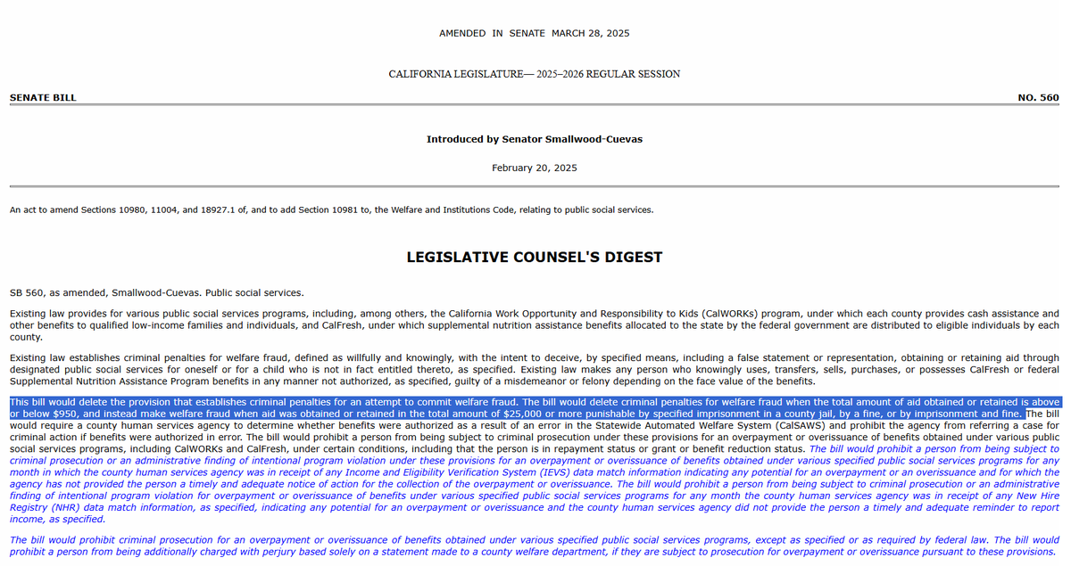 The democrat criminals who have completely destroyed California, which will never recover, are trying to protect other democrat criminals by pushing a new Senate bill that would decriminalize welfare fraud, and prohibit any prosecutions of fraud criminals to take place. California Democrat state senator Lola Smallwood-Cuevas has introduced SB560, a bill that would decriminalize welfare fraud below $25,000. It would also prohibit prosecutions for welfare fraud and would prohibit someone from being charged w/ perjury if they are subject to prosecution for welfare fraud. Democrats are criminals!